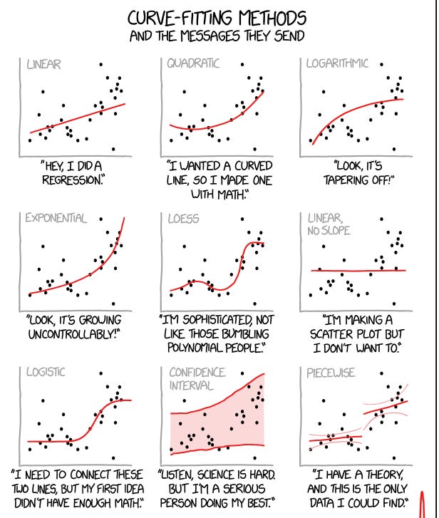 But, how good is your curve in fitting the data? Imagine you managed to get a response from 100 respondents. And assume you use only 1 independent variable, which curve you’d get? Is it linear linear, or curvy, or quadratic?